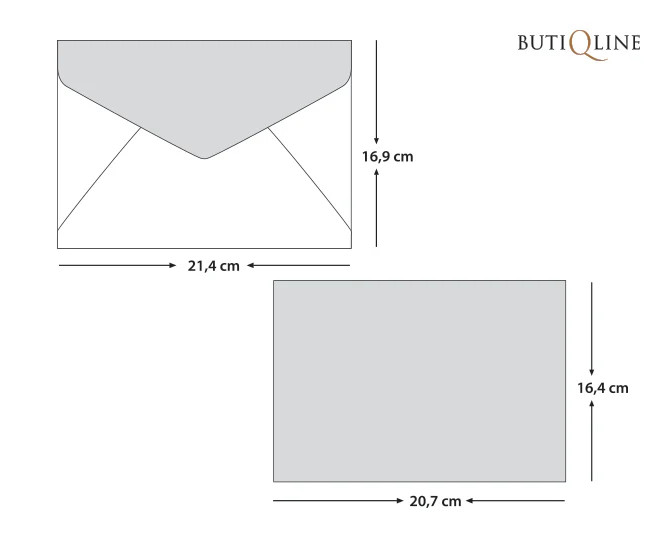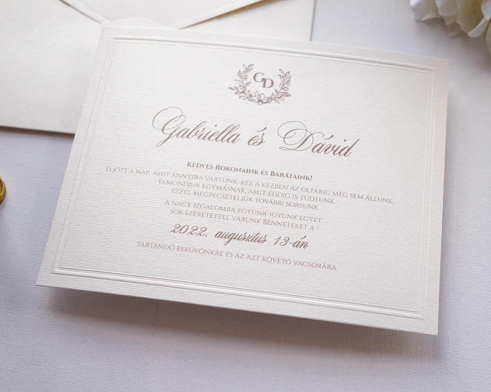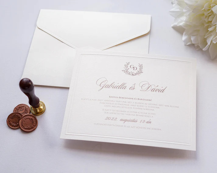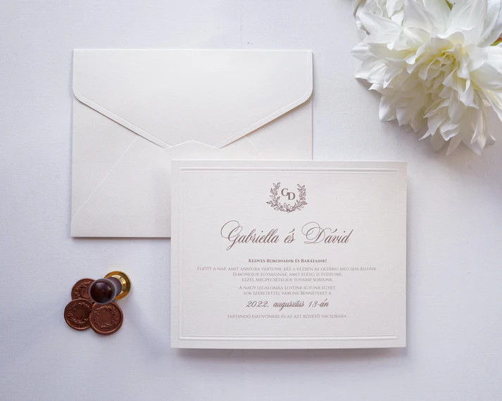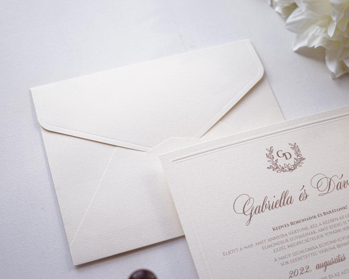 A meghívó 470 g/m2 extra vastag prémium bordázott papírból készül. Ez a kiemelkedően vastag papír rendkívül stabil tartást és luxus megjelenést biztosít. A boríték 270 g/m2 extra vastag prémium papírból készül, amely tökéletesen illeszkedik a meghívó minőségéhez.