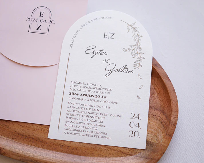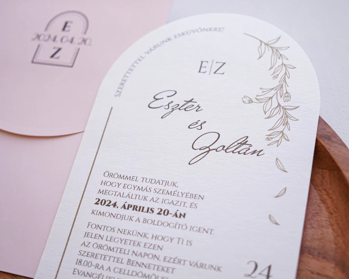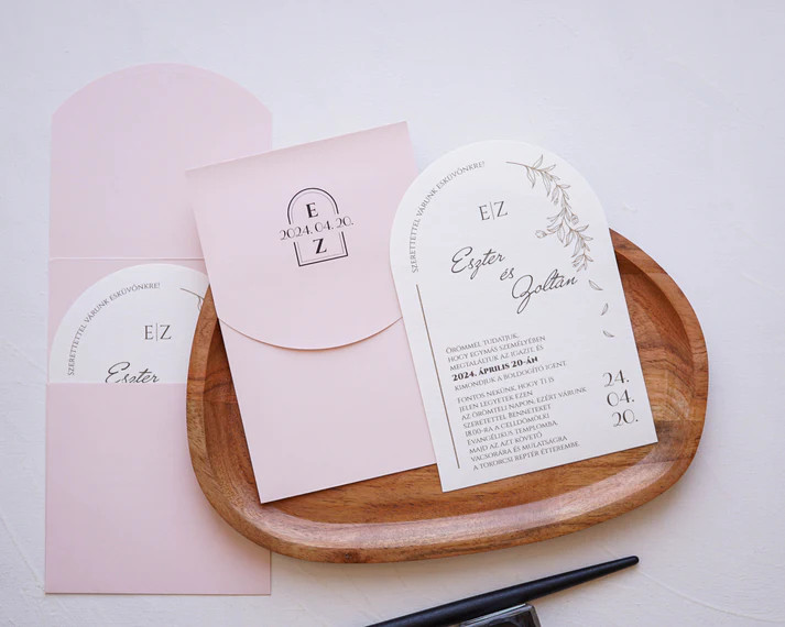 A meghívó prémium minőségű papírból készül, amely elegáns megjelenést és stabil tartást biztosít. A képeken látható boríték tökéletesen illeszkedik a meghívó stílusához, és egységes, esztétikus megjelenést biztosít.