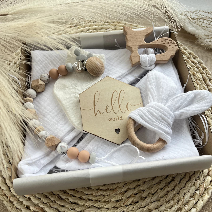 A csomag kézzel készített, biztonságos baba kiegészítőket tartalmaz, amelyek nemcsak szépek, hanem praktikusak is a mindennapok során. A benne található termékek – például nyálkendő – segítik a baba kényelmét és ápolását, miközben esztétikus ajándékként is megállják a helyüket