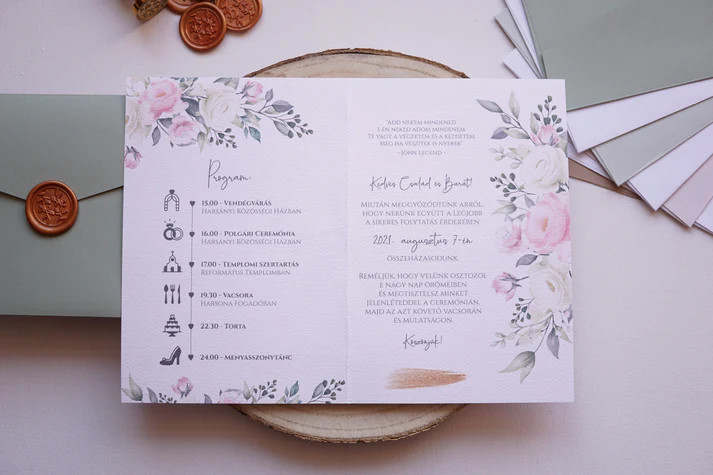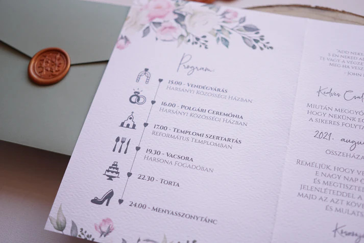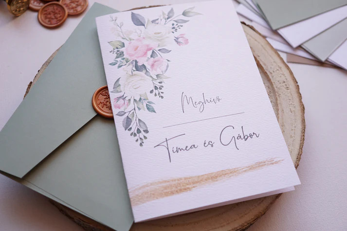 A meghívó szövegét megrendeléskor a „meghívó szövege” mezőben tudjátok megadni. Itt tüntethetitek fel a neveket, az esemény időpontját, helyszínét és minden további fontos információt.