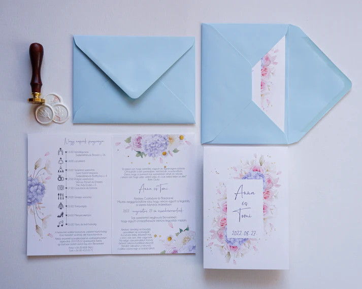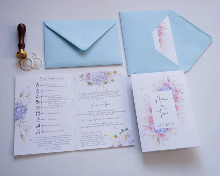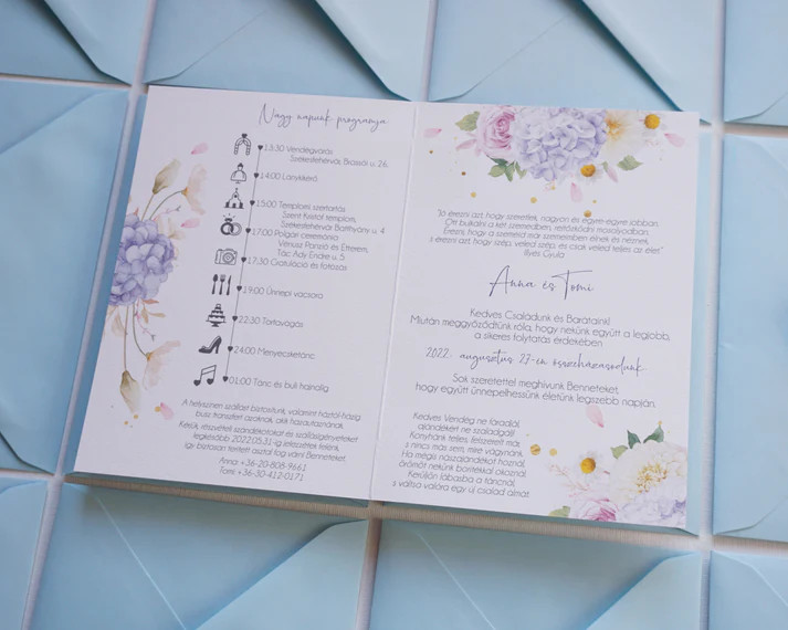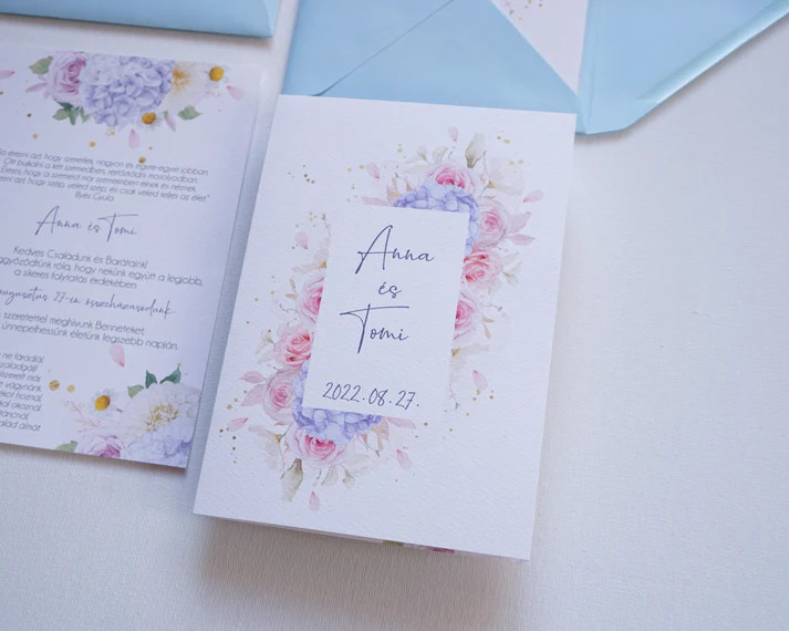 Ez a hortenzias esküvői meghívó romantikus és elegáns választás azoknak a pároknak, akik virágos, mégis letisztult megjelenést szeretnének. A hortenzia minta finom és harmonikus hangulatot teremt, amely tökéletesen illik klasszikus, modern vagy szabadtéri esküvőkhöz is.