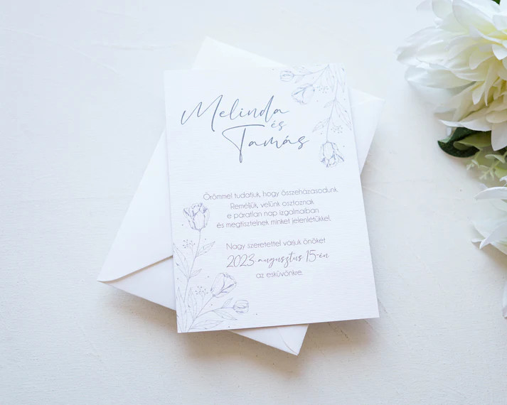 Ez a letisztult esküvői meghívó tökéletes választás azoknak a pároknak, akik elegáns, modern és időtálló megjelenést szeretnének. A minimalista design a tipográfiára és a prémium papír minőségére helyezi a hangsúlyt, így kifinomult és exkluzív összhatást biztosít.
