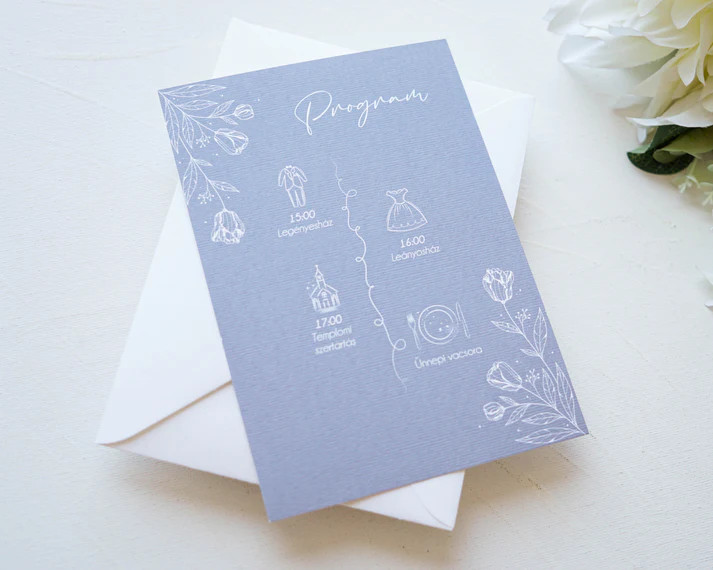 A meghívó mérete 12 cm széles és 17 cm magas. A kétoldalas kialakítás elegendő helyet biztosít minden fontos információ elegáns és áttekinthető megjelenítéséhez.