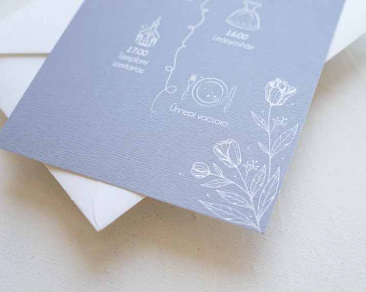A meghívót 280 g/m2-es prémium minőségű, enyhén bordázott olasz művészpapírból készítjük. Kérésre választható fehér vagy krém színű papírból is, így a meghívó tökéletesen illeszkedhet az esküvő stílusához.