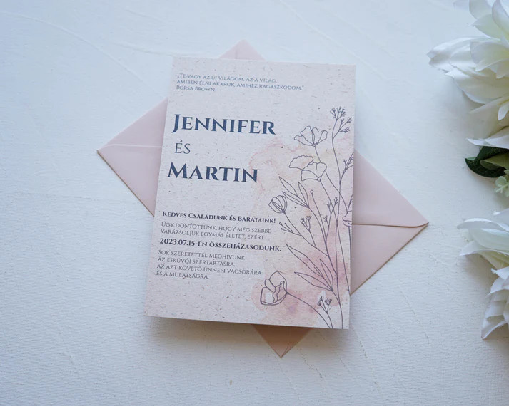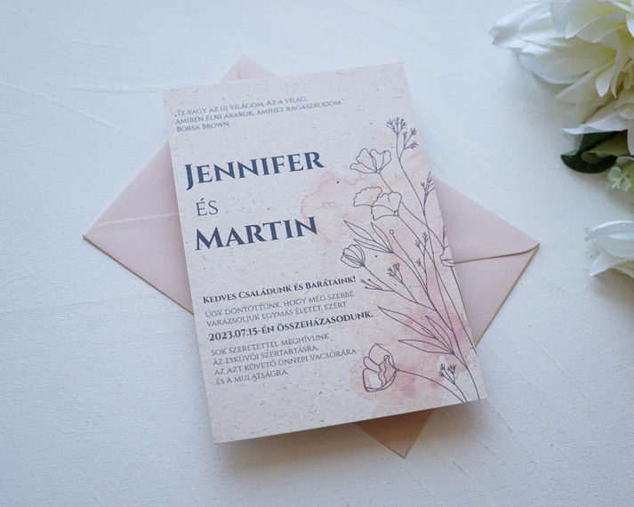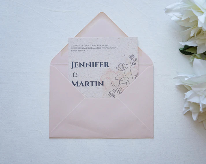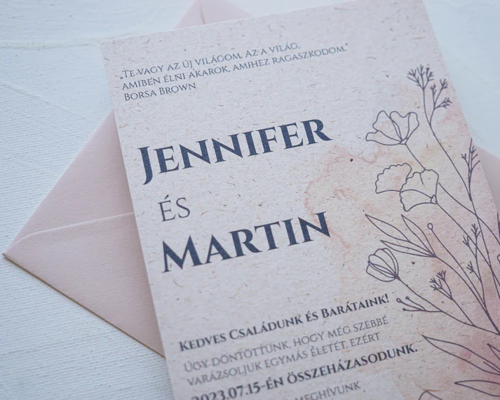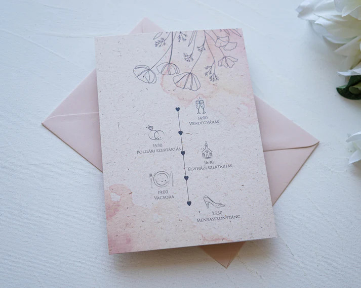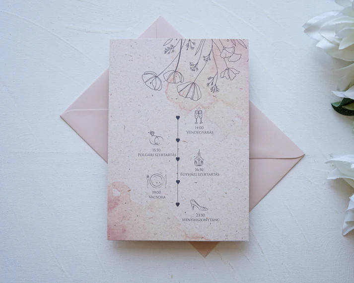 A meghívót extra vastag, 320 g/m2-es különleges bézs színű újrahasznosított papírból készítjük. Ez a prémium papír stabil tartást és exkluzív megjelenést biztosít, miközben környezetbarát választás.