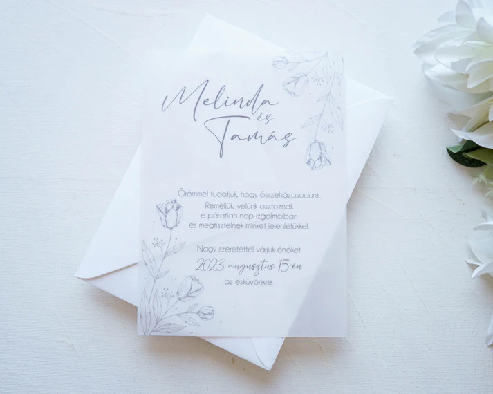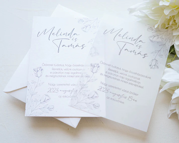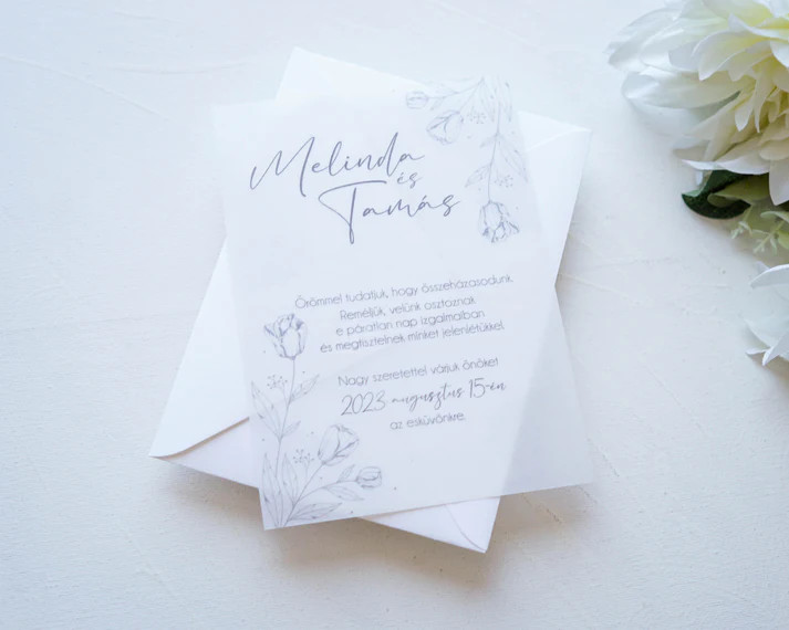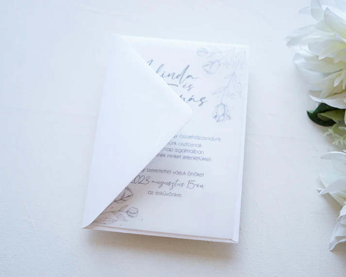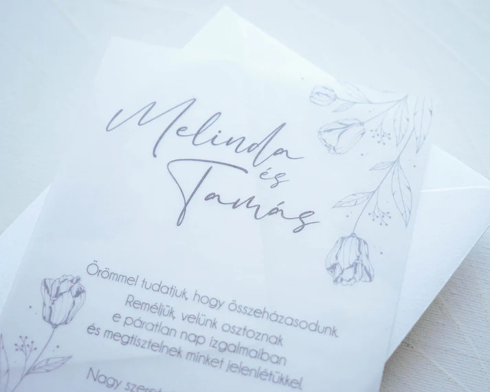 Ez az áttetsző pausz esküvői meghívó modern és elegáns választás azoknak a pároknak, akik különleges és minimalista megjelenést szeretnének. Az áttetsző papír légies és prémium hatást biztosít, amely igazán egyedi első benyomást kelt a vendégek számára.