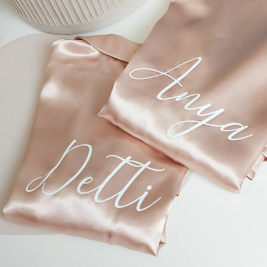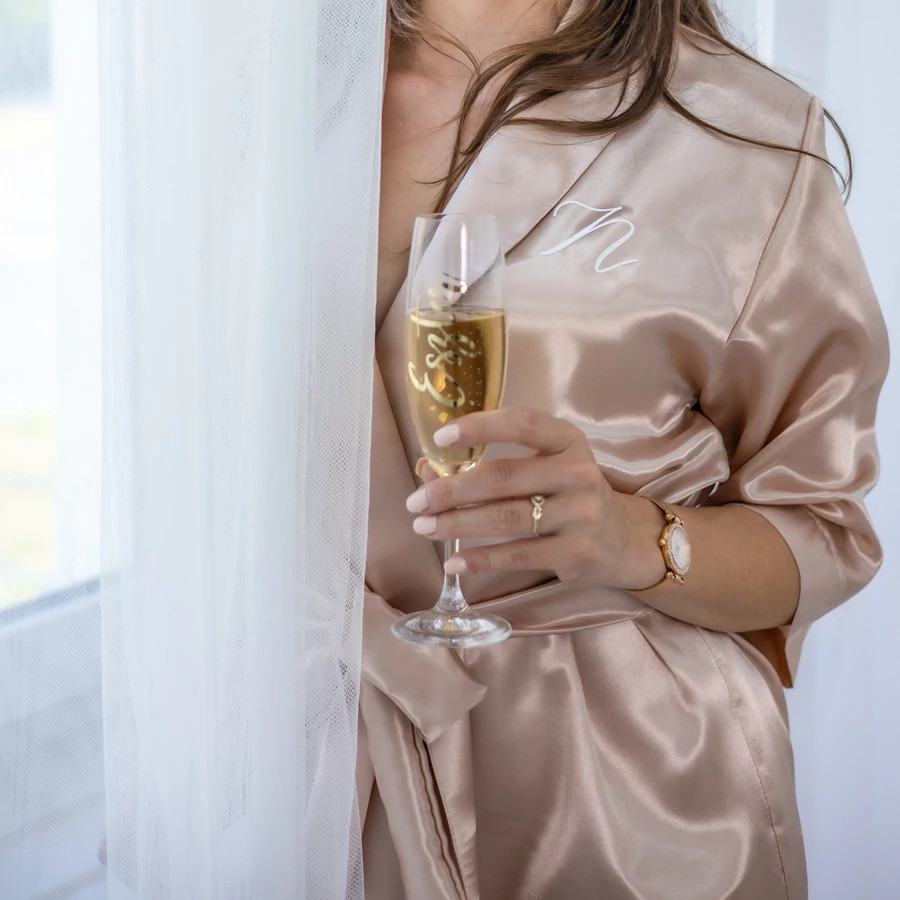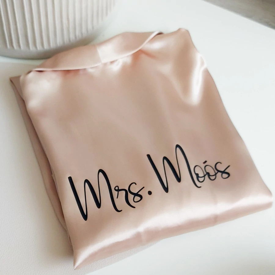 A prémium szatén anyag könnyű és kényelmes viseletet biztosít, így ideális a nagy nap reggelére. A köntös teljes mértékben személyre szabható: kérhetsz rá nevet, „Bride”, „Bridesmaid” vagy bármilyen egyedi feliratot.