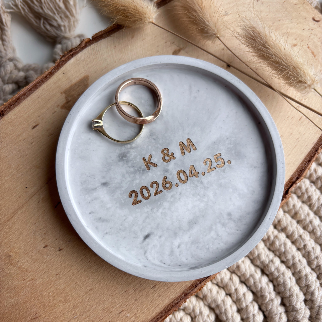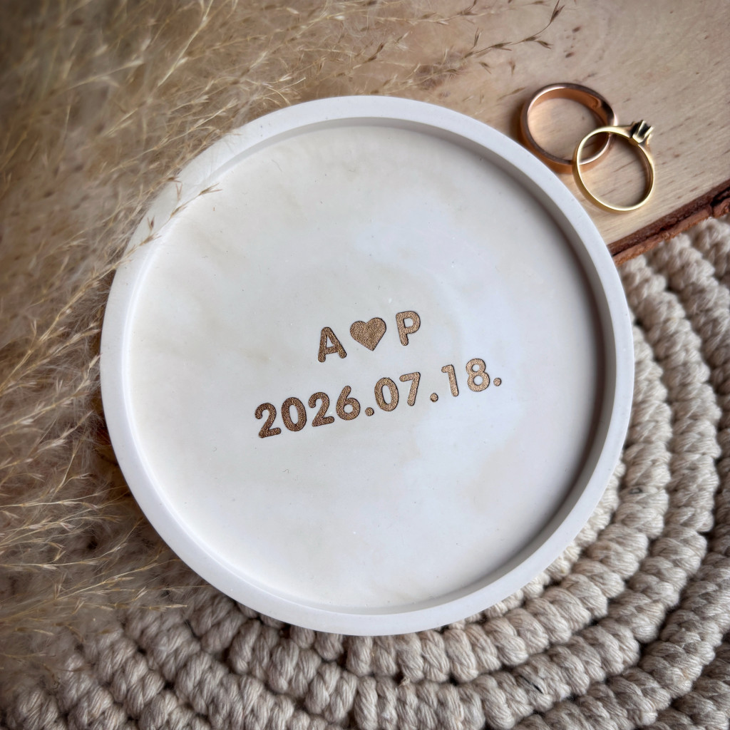 Az egyedi nyomtatott stílusú gyűrűtartó tálka dátummal tökéletes választás, ha letisztult, modern és személyes esküvői kiegészítőt keresel. Ez a különleges ékszertartó nemcsak a gyűrűátadás meghitt pillanatát teszi még emlékezetesebbé, hanem az esküvő után is maradandó emlékként szolgál.
