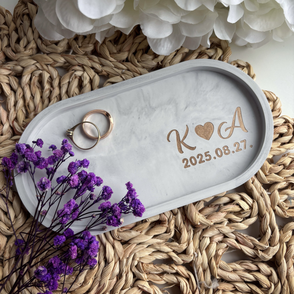 A tálka monogrammal és az esküvő dátumával személyre szabható, így valóban egyedi emléktárgy készül. A kalligrafikus betűtípus romantikus, finom hatást kelt, amely kiemeli a gyűrűátadás jelentőségét.