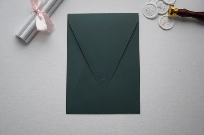 A gondosan kialakított méret lehetővé teszi különböző meghívók kényelmes elhelyezését, miközben a sötét zöld szín harmonikusan illeszkedik modern, vintage vagy klasszikus stílusú esküvői dekorációkhoz is.