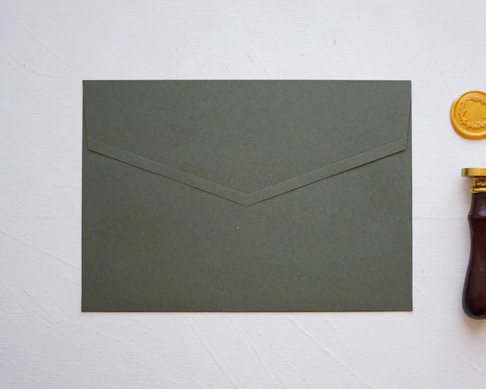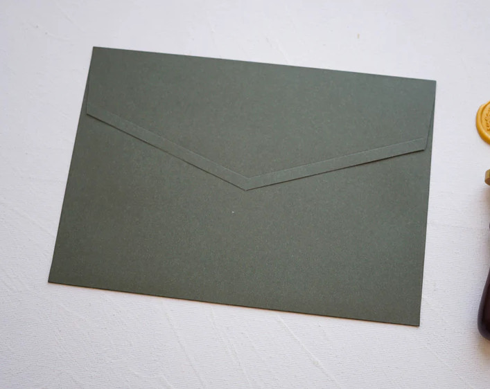 A olíva zöld díszboríték 20 × 14 cm méretben elegáns és stílusos megoldás esküvői meghívók, alkalmi kártyák és különleges események meghívóinak átadásához. A cappuccino árnyalat meleg, természetes hatást kelt, amely tökéletesen illeszkedik rusztikus, vintage vagy klasszikus esküvői dekorációkhoz.