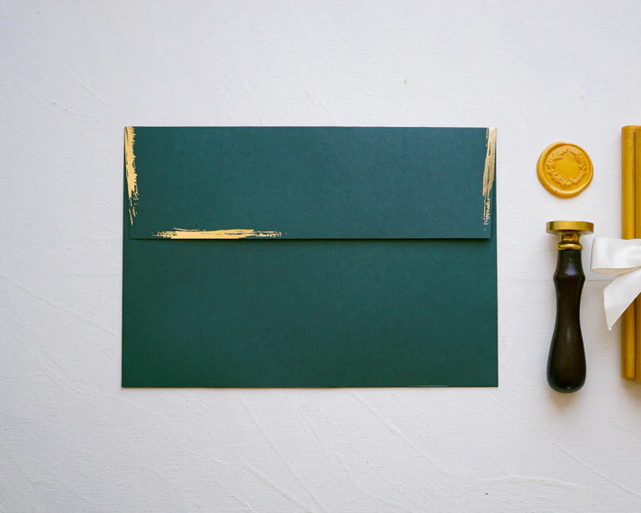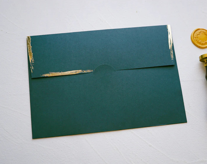 Az aranyozott sötét zöld díszboríték 20 × 14 cm elegáns és különleges megjelenést biztosít esküvői meghívók, ünnepi kártyák és exkluzív rendezvények meghívói számára. A mély zöld szín és az arany fóliázott díszítés luxus hatást kelt, így már a meghívó átadásakor prémium benyomást teremt.