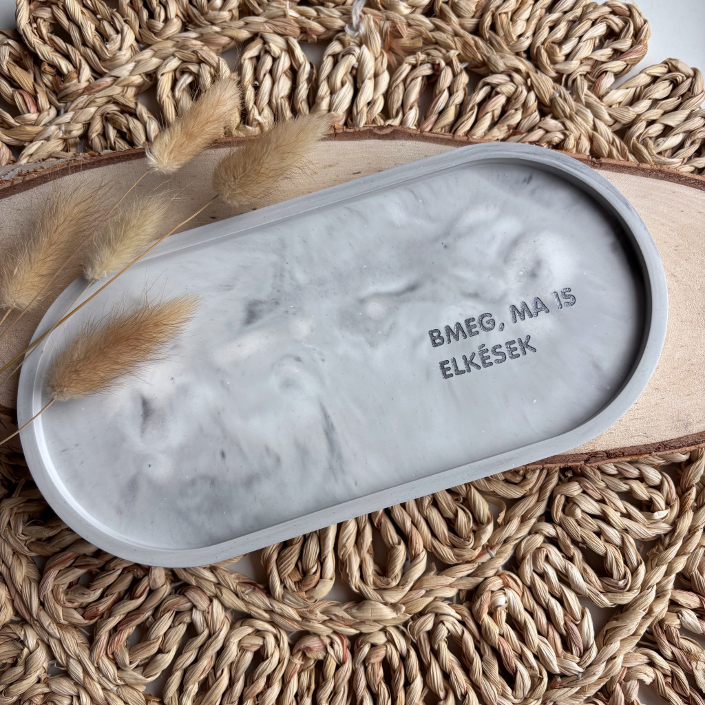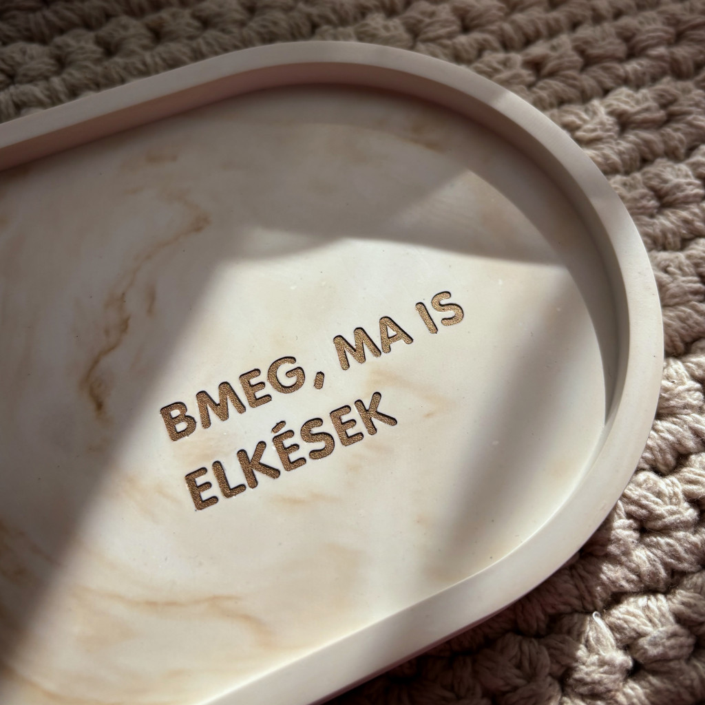 A „Bmeg ma is elkések” feliratos ékszertartó tálka egy igazán karakteres és vicces ajándék, amely tökéletes választás azoknak, akik mindig egy kicsit késésben vannak – és ezt humorral kezelik. A nagy méretű kivitelnek köszönhetően nemcsak dekoratív, hanem kifejezetten praktikus is: ideális ékszerek, kulcsok vagy egyéb apróságok tárolására. A tálka minden darabja kézzel készül, így garantáltan egyedi és megismételhetetlen. A natúr bézs szín letisztult, modern megjelenést biztosít, amely bármilyen otthoni környezetbe könnyedén illeszkedik.