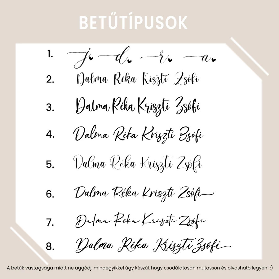 - Felirat színek: fekete, fehér, arany, ezüst, rose gold