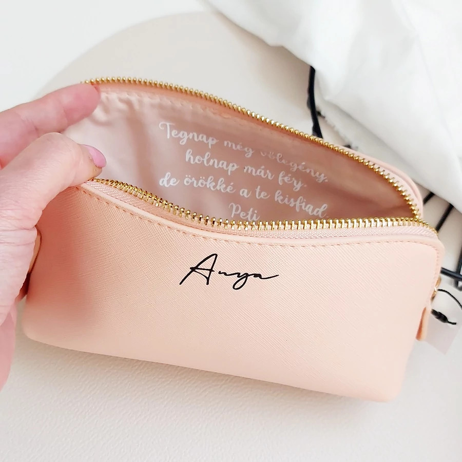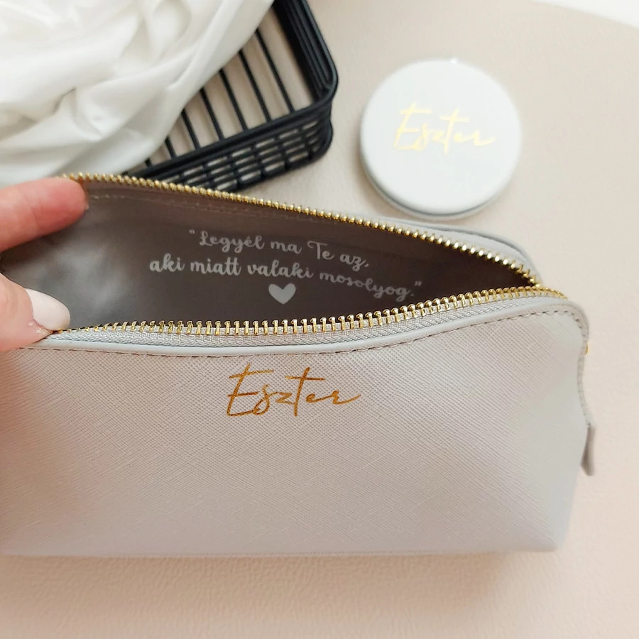 A feliratozott kozmetikai táska egy letisztult, elegáns és rendkívül praktikus ajándék, amelyet teljes mértékben személyre szabhatunk. Az egyedi név, monogram vagy rövid üzenet teszi igazán különlegessé, így nemcsak hasznos, hanem érzelmi értékkel is bír. Tökéletes választás mindennapi használatra vagy ajándékként, hiszen egyszerre stílusos és funkcionális. A különböző színek, feliratok és méretek révén könnyedén az ajándékozott személyiségéhez igazítható.