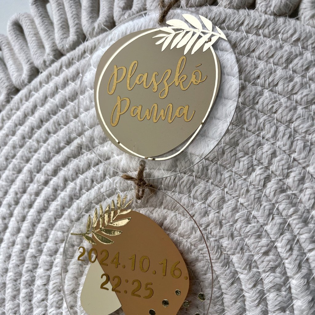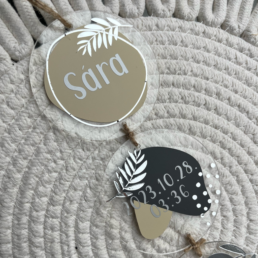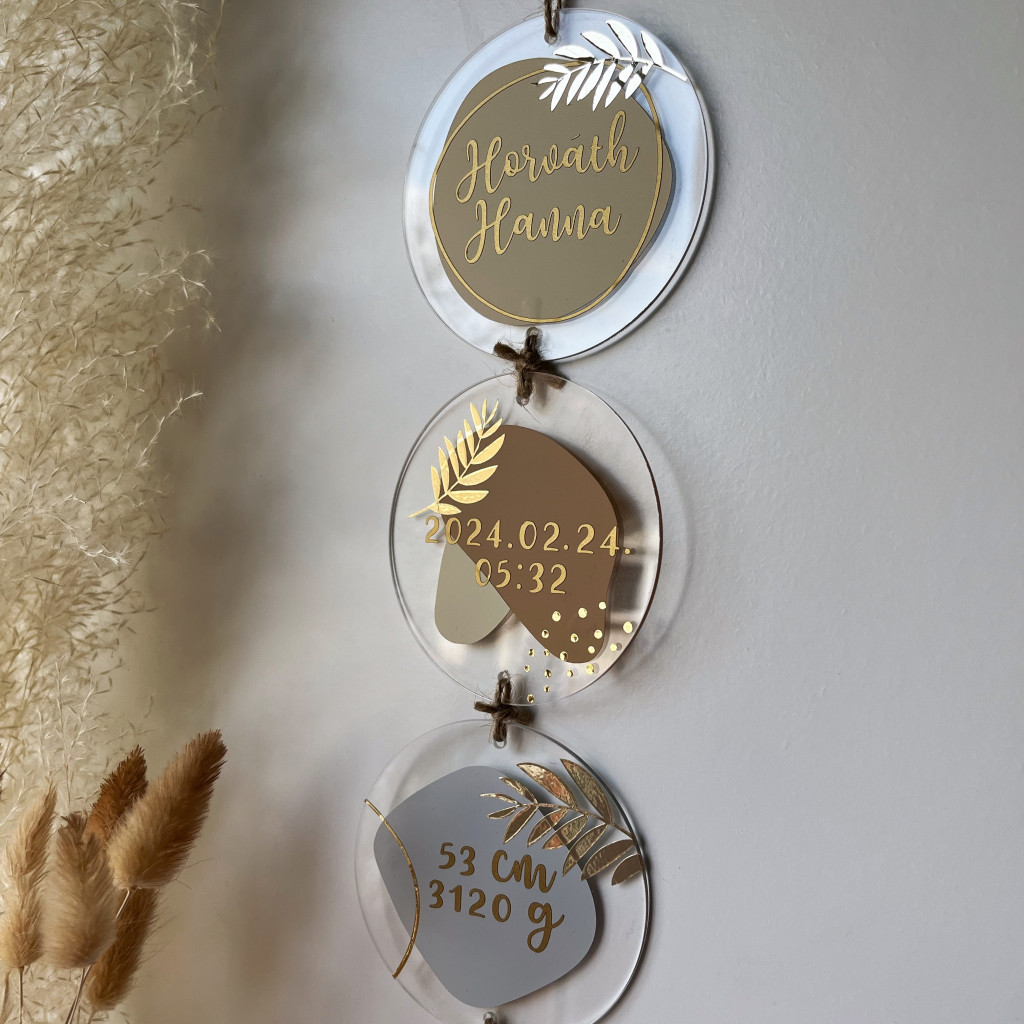 Ez a különleges, névre szóló babaszoba dekoráció egyszerre dekoráció és emlékőrző, amely tökéletes választás újszülött érkezésekor. A letisztult, bézs-arany stílus elegáns megjelenést biztosít, így harmonikusan illeszkedik bármilyen babaszobába. A 3 darabos plexi korong szett személyre szabható felirattal készül, így valóban egyedi és maradandó emlékké válik a család számára. Ideális ajándék babalátogatóba, keresztelőre vagy babaköszöntő alkalmakra.