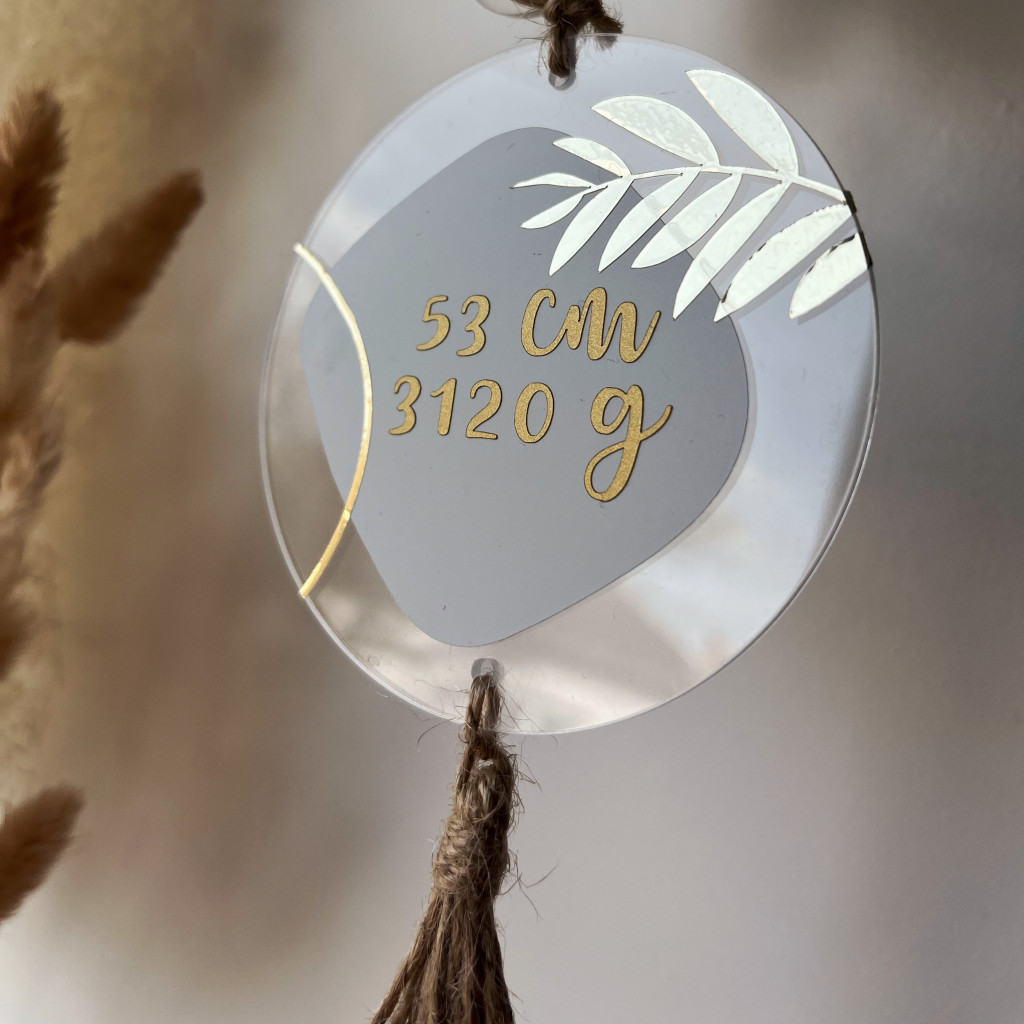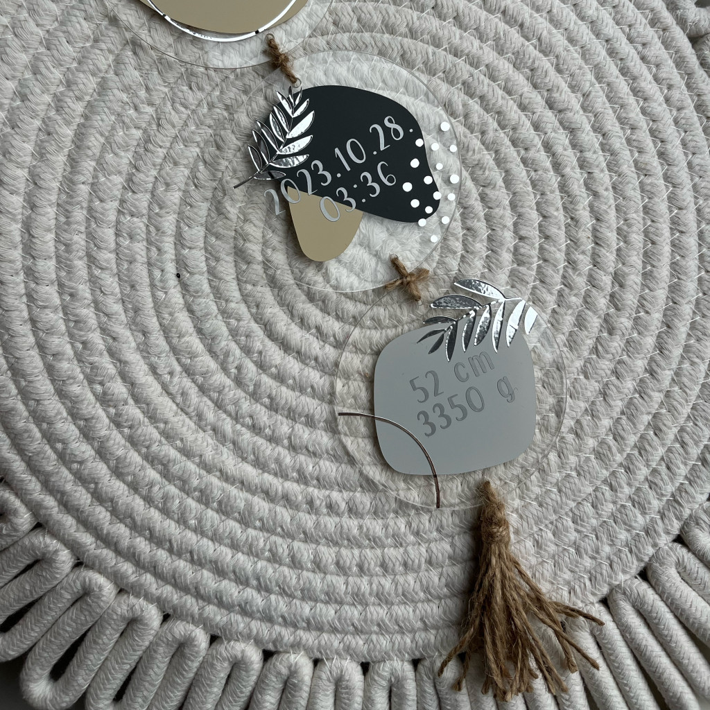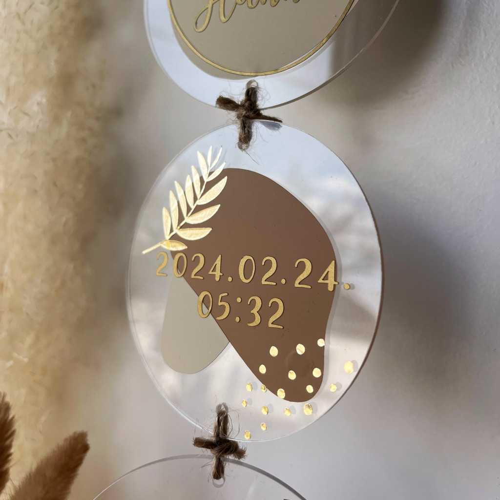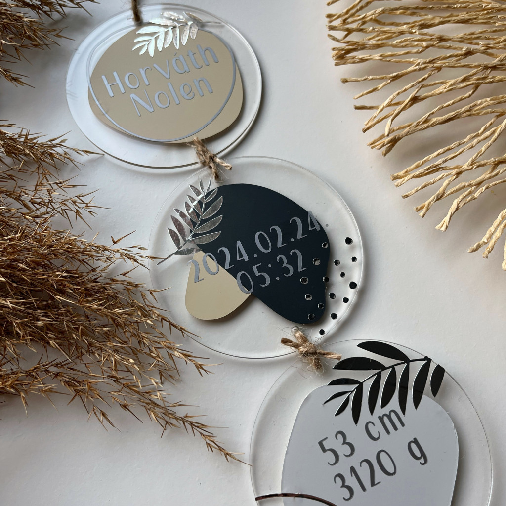 Ez a különleges, névre szóló babaszoba dekoráció egyszerre dekoráció és emlékőrző, amely tökéletes választás újszülött érkezésekor. A letisztult, bézs-arany stílus elegáns megjelenést biztosít, így harmonikusan illeszkedik bármilyen babaszobába. A 3 darabos plexi korong szett személyre szabható felirattal készül, így valóban egyedi és maradandó emlékké válik a család számára. Ideális ajándék babalátogatóba, keresztelőre vagy babaköszöntő alkalmakra.