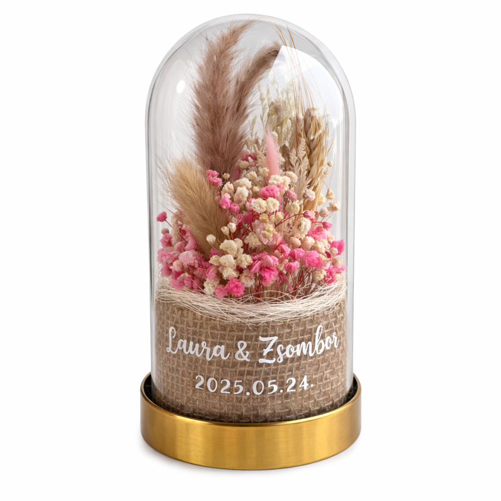 Tedd igazán emlékezetessé az esküvő egyik legmeghatóbb pillanatát ezzel az egyedi kézműves virág ajándékkal. Az elegáns üvegbúrába zárt szárított virágkompozíció tökéletes szülőköszöntő ajándék, amely hosszú éveken át őrzi a nagy nap emlékét.