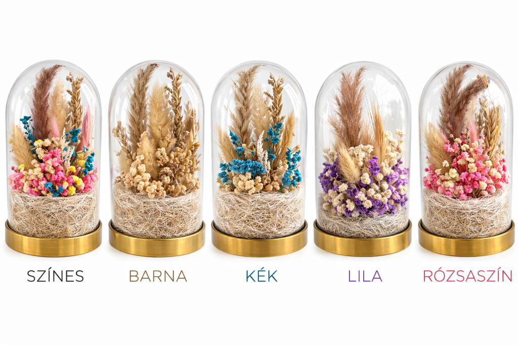 A virágkompozíció minden darabja kézzel készül, ezért nincs két teljesen egyforma ajándék. A szárított virágok tartósak és nem igényelnek gondozást, így a búra hosszú ideig megőrzi esztétikus megjelenését.
