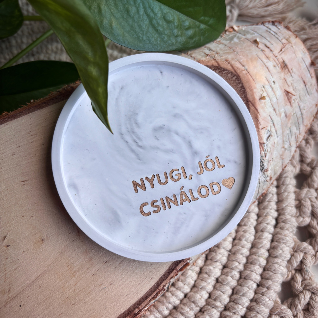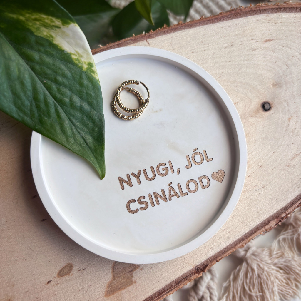 A „Nyugi, jól csinálod” feliratos ékszertartó tálka nemcsak egy praktikus tároló, hanem egy apró, mindennapi motiváció is. Tökéletes választás, ha szeretnél valakit – vagy akár saját magadat – egy kis pozitív megerősítéssel megajándékozni.